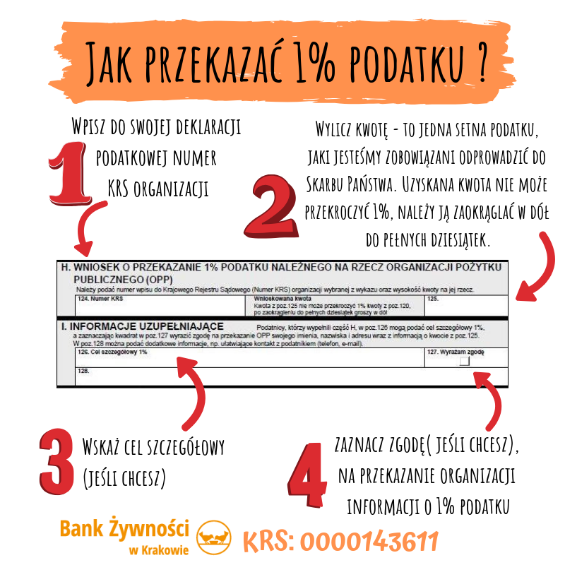 Pomóżcie nam Państwo działać jeszcze efektywniej, podarujcie nam swój 1% podatku, a my zamienimy go w żywność dla osób najbardziej potrzebujących.